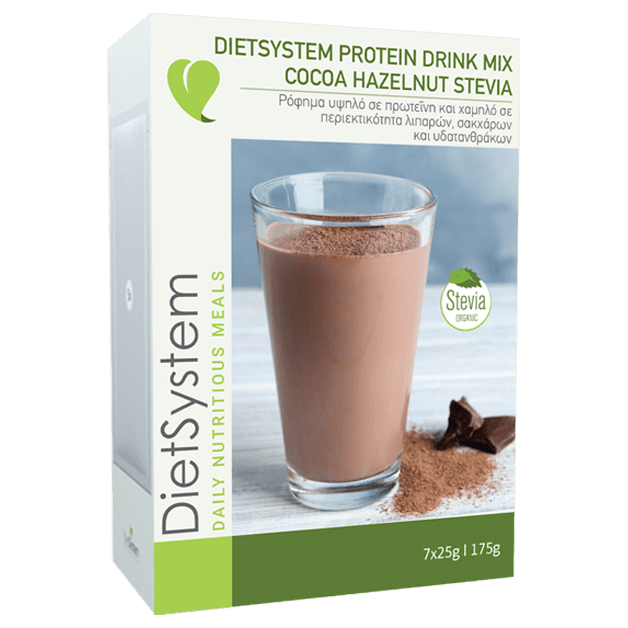Ρόφημα DietSystem με γεύση φουντούκι κακάο με στέβια. Το Θρεπτικό πρωτεϊνούχο ρόφημα της DietSystem αποτελέι ένα γευστικό και υγιεινό υποκατάστατο γεύματος που σας προσφέρει μία εξαιρετική ισορροπία υψηλής ποιότητας πρωτεϊνών από γάλα και βασικών θρεπτικών συστατικών καθώς και πρόσθετων βοτάνων.